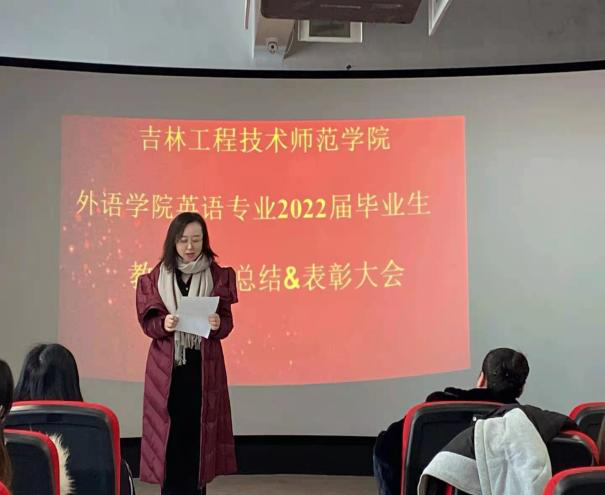 2020年12月15日上午8:00,外语学院在第二实验楼619召开英语专业2022届毕业生教育实习总结表彰及就业工作推进大会。外语学院副院长赵文博、党总支副书记杨德成、宽城区长盛小学校长徐慧丽、全体实习指导教师、2022届毕业生辅导员徐珊珊出席会议,2022届英语专业全体学生参加会议。会议由外语学院教学副院长宋善波主持。