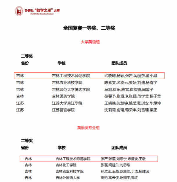 6月19日,2024年外研社杯“教学之星”大赛全国复赛结果揭晓,我院大学英语参赛教师武晓璐、杨颖、张岩、闫丽莎、董小晶荣获大学英语组全国复赛二等奖;英语专业参赛教师张严、张蓓,刘思宁,宋善波、王敏荣获英语类专业组全国复赛二等奖。
