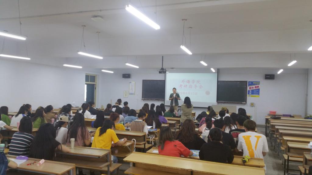 外语学院召开考研指导会 来源:综合新闻 2019/06/14 为加强对学生硕士研究生考试的指导,提高学生考研率,6月13日晚,外语学院在二教306召开考研指导会。外语学院大二以上70余名同学参加了指导会,会议由党总支副书记赵春阳主持。 会上,副院长赵文博首先从宏观角度就大学生考研进行了说明和指导。随后,海天考研、新启航考研两家考研培训机构的指导老师,分别从考研的目的、考研的趋势、学校的选择、专业的选择、学习方法、学习技巧等方面进行了全方位的指导,指导会近两个小时。