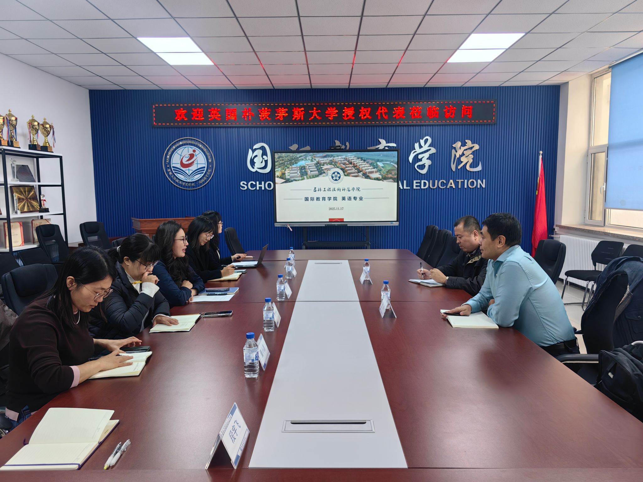 2025年11月17日下午1时,英国朴次茅斯大学中国区授权代表——吉林省港湾教育科技有限公司总经理肖冰、副总经理王枫一行莅临我院洽谈合作事宜。yl23411集团院长李娟主持会谈,副院长刘思宁及相关专业教师出席本次会议。