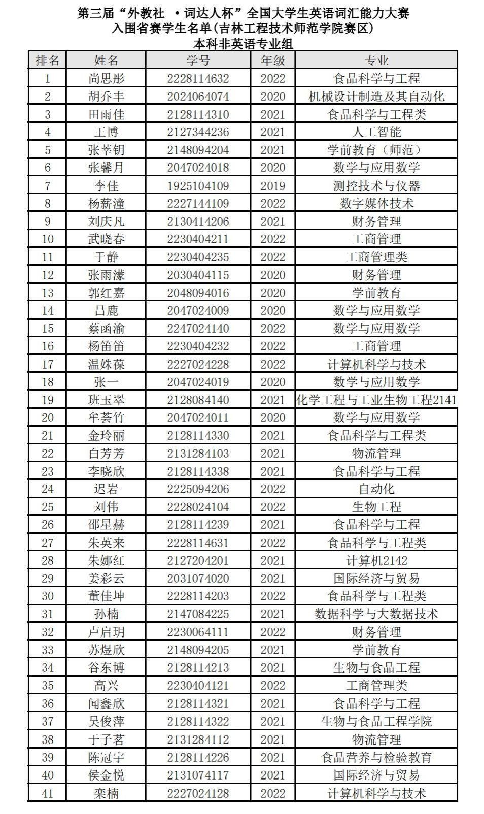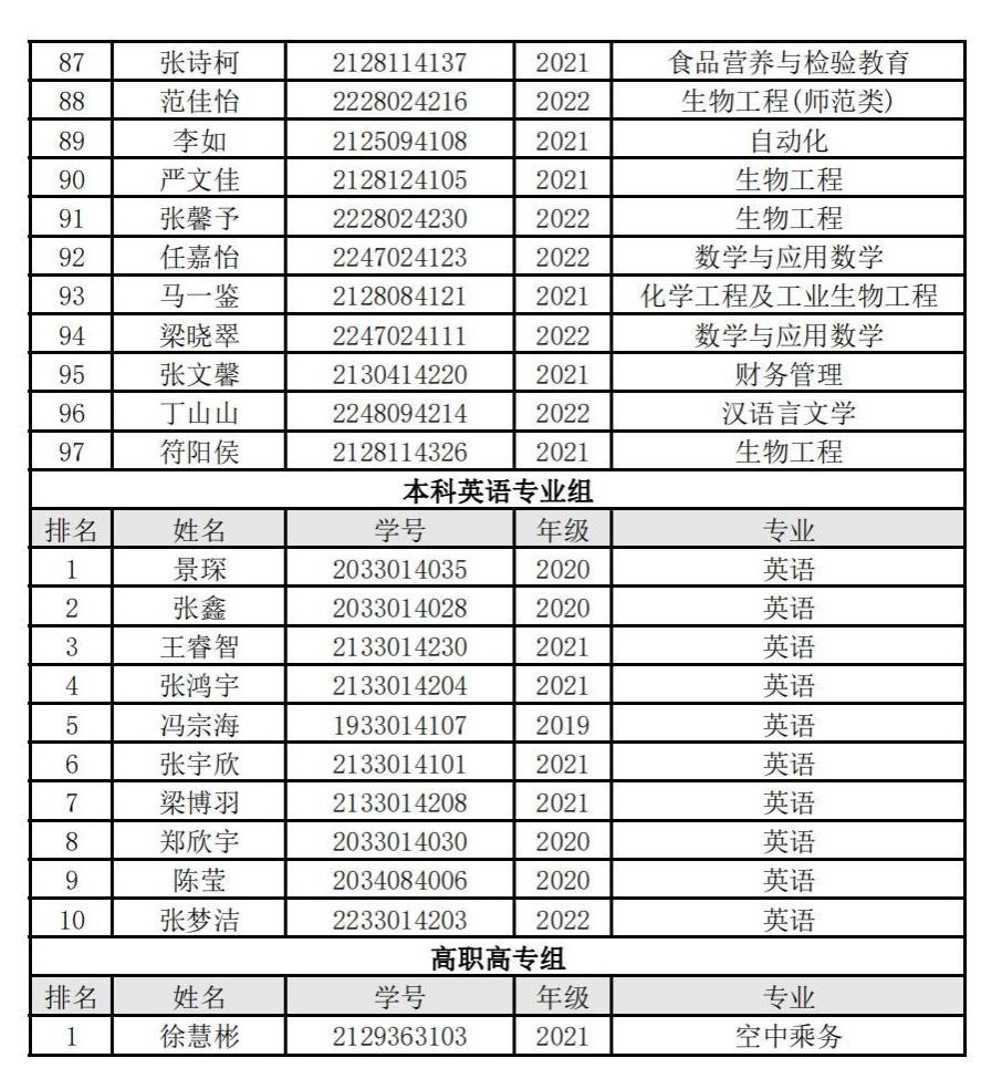 本次比赛通过外教社“词达人”公众号进行,“词达人”平台对比赛全过程进行了监控,保证了比赛的公正与诚信。全校共有1514名学生积极报名参赛,比赛分为英语专业组、非英语专业组和高职高专非英语专业组进行。经过激烈角逐,本科英语专业组10名学生、本科非英语专业组97名学生和高职高专非英语专业组1名学生入围省赛。现将各组别晋级省赛名单公布如下: