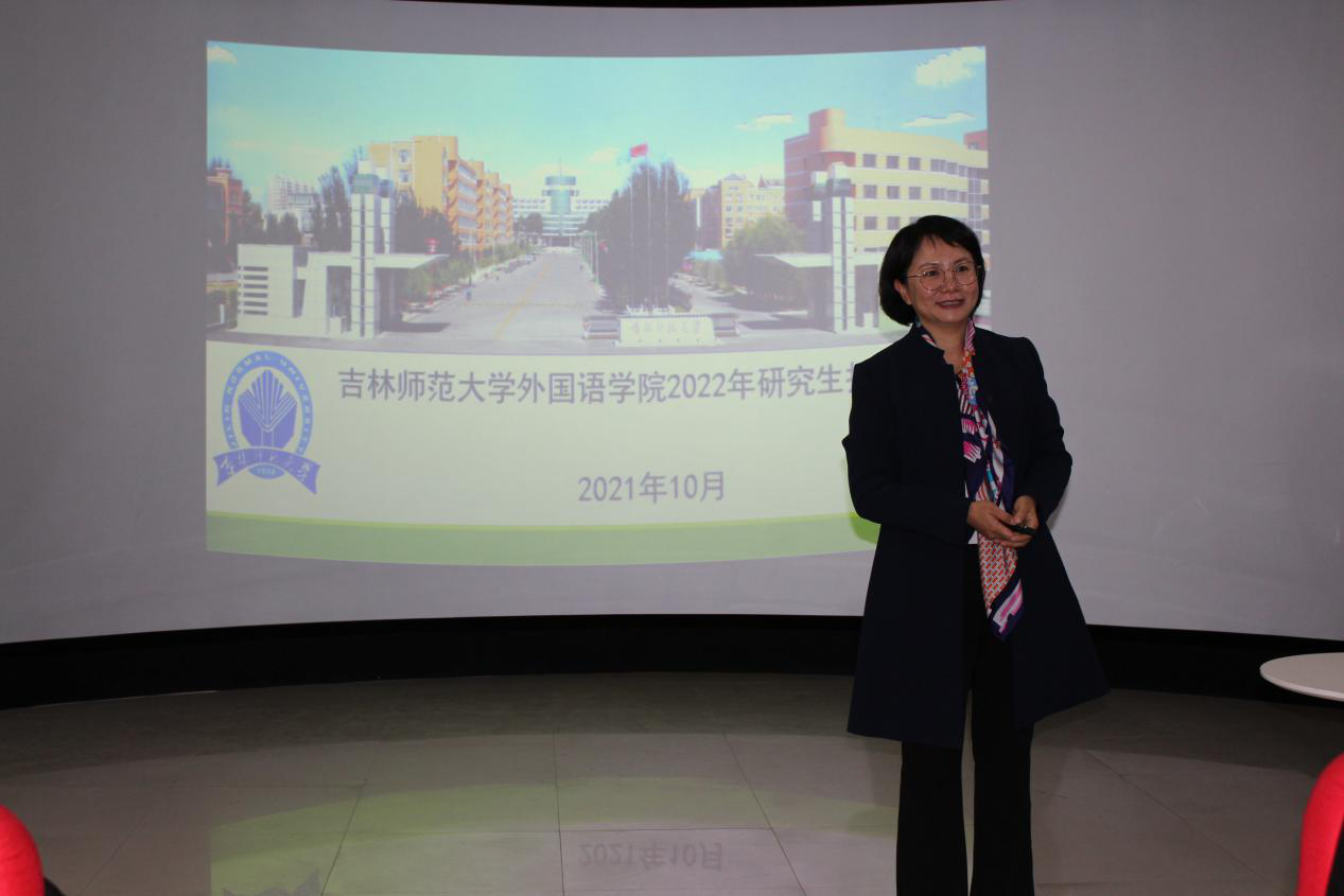高卫红院长首先从总体上介绍了吉林师范大学,从而使同学们了解到了吉林师范大学历史悠久,人文底蕴雄厚;其次高卫红院长从吉林师范大学外国语学院的办学历史,师资队伍、人才培养、办学条件等方面介绍了吉林师范大学外国语学院的历史、现状及优势;最后高卫红院长重点向同学们介绍了外语学院申报硕士点的历程、语言学专业研究生的学习和科研方向,并且针对语言学专业研究生阶段学习的认识和科研方向做出了合理的规划,从个人培养计划,课程学习,中期考核等多个环节以及各方向初试和复试所考科目及录取情况等进行了系统的介绍。使同学们对吉林师范大学外语学院英语各方向研究生初试、复试;研究生学习;学期考核及毕业论文撰写等方面有了清晰的认识。