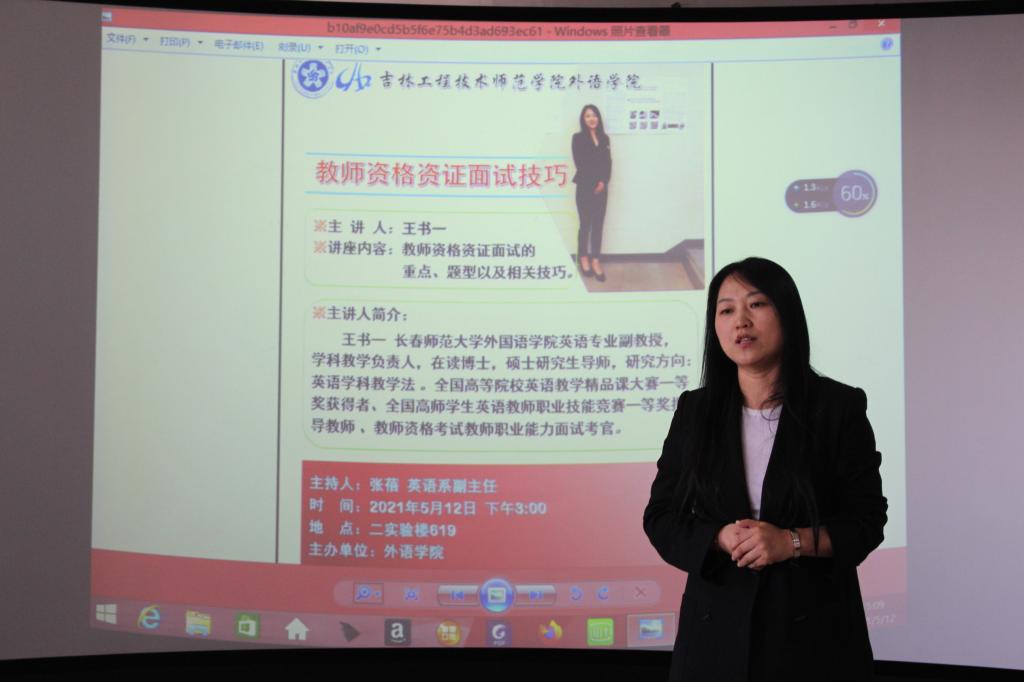为提高外语学院同学们教资考试面试的成功率,熟练的掌握教资面试的技巧,5月12日下午我院在二实验楼619举办了教资考试面试辅导讲座。主讲人为我院特邀嘉宾——长春师范大学外国语学院教资面试考官王书一副教授。学院副院长赵文博,教学副院长宋善波,2017级和2018级同学参加了此次讲座,此次讲座由英语专业教研室副主任张蓓主持。