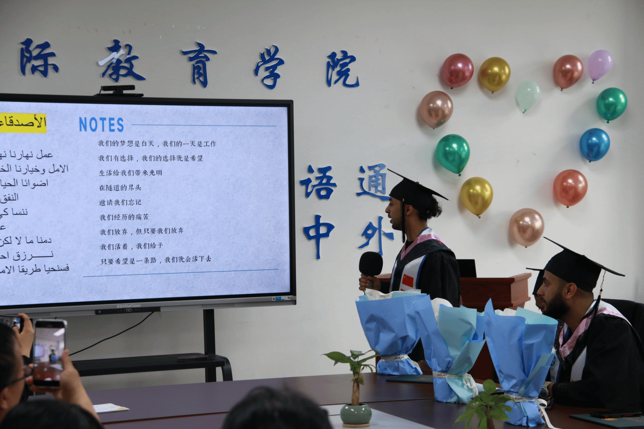 仪式上五名留学生分别用中文发表了毕业感言,他们字正腔圆、言之有物、条理清晰、文采斐然。李白同学还演唱了阿拉伯歌曲《عهد الأصدقاء》(《朋友的誓言》),歌词对友情娓娓道来,让人动容。